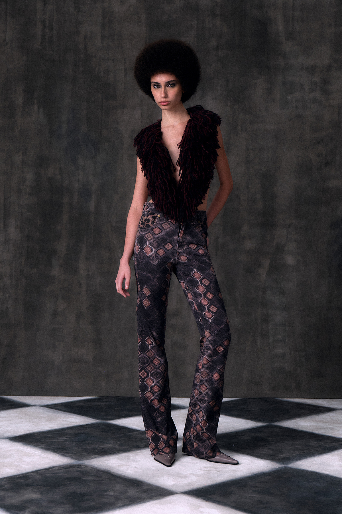 Estampa con la chakana , símbolo milenario de los pueblos originarios de los Andes. Con forma de cruz cuadrada, simboliza la conexión entre el mundo terrenal, el espiritual y el interior.
