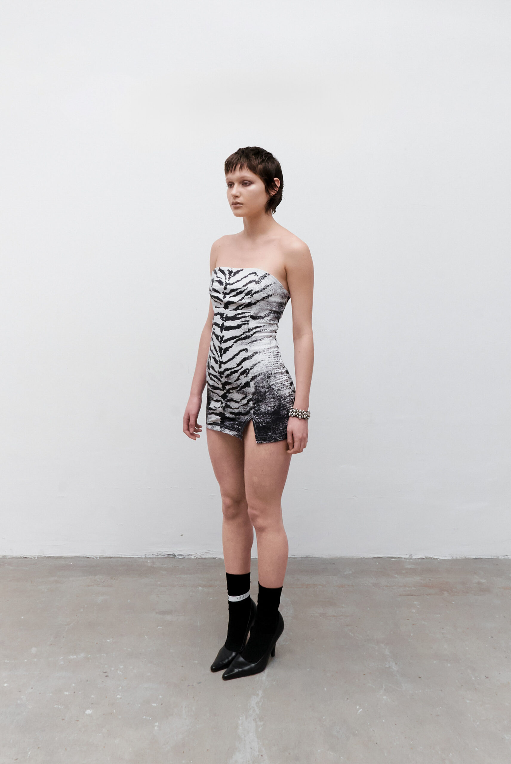 Micro – vestido strapless de zebra. Tajo en el frente.
