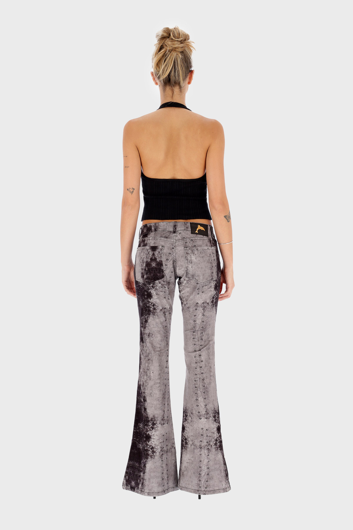 Jeans de corte oxford con estampa de ataduras y cueros. Faux corsette.