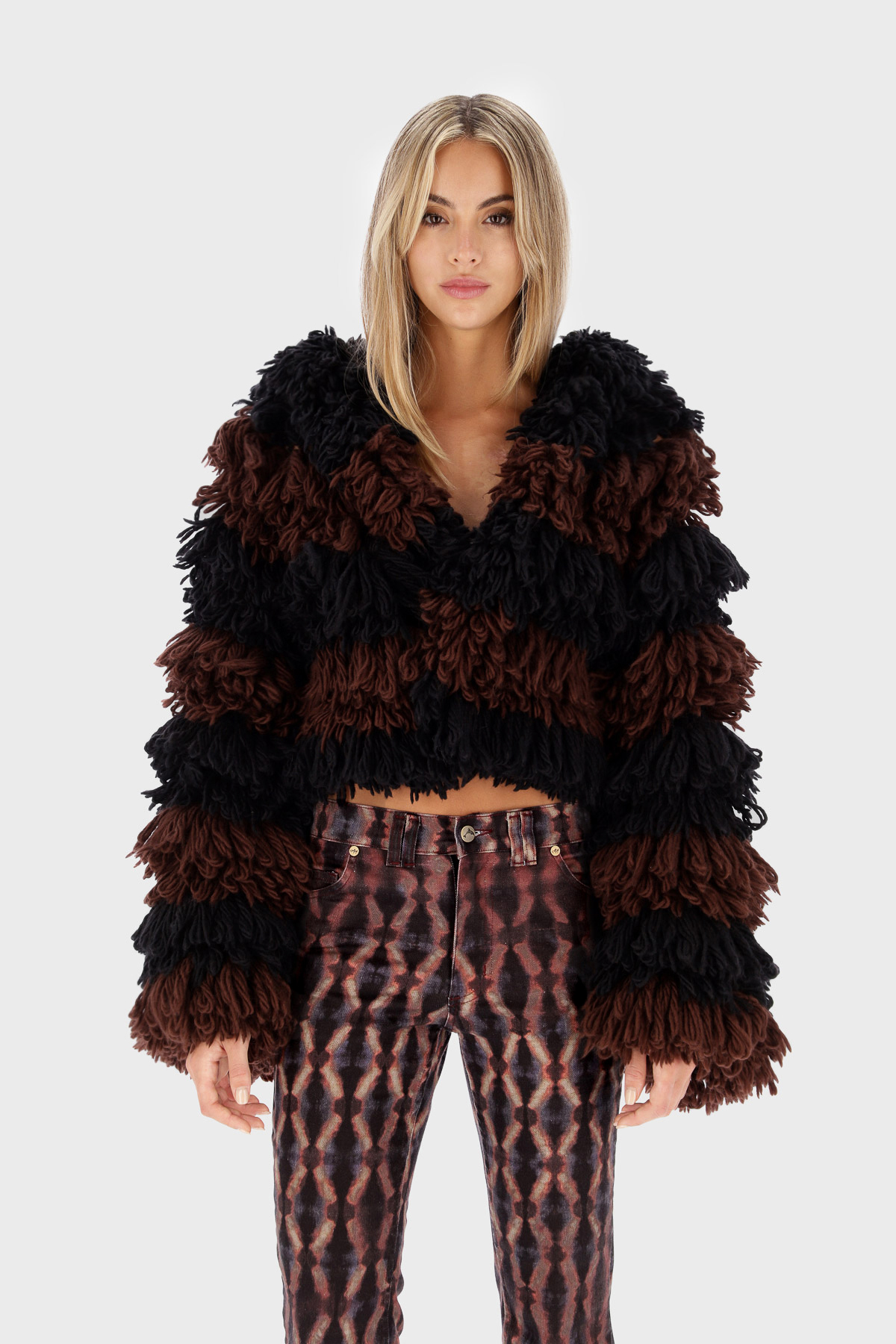 Tapado corto de lana tejida a mano, rayado en color chocolate y negro. Unico talle.